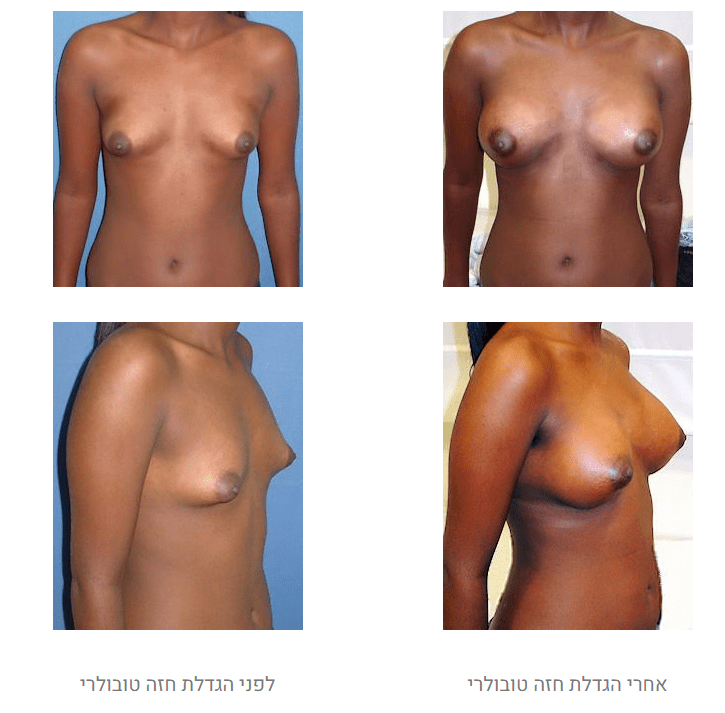 מראה השדיים צינורי עקב עודף עור ביחס לרקמת שד. חזה טובולרי כזה ירוויח מניתוח הרמת חזה בשילוב שתל סיליקון לא גדול. בצורה זו ניתן לשלוט לא רק בנפח כל שד אלא אף בצורתו ולתקנה ביעילות רבה.